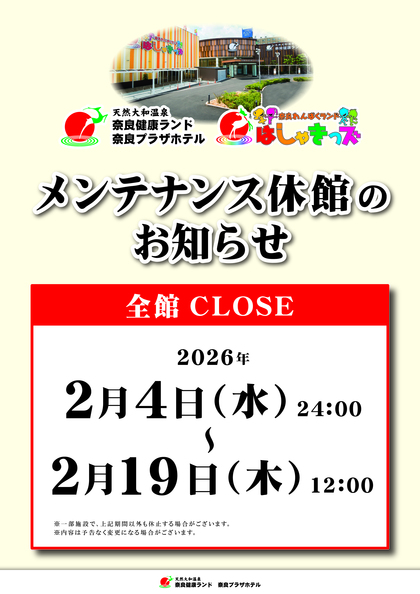 奈良健康ランド及び奈良プラザホテル、奈良わんぱくランドはしゃきっズは下記の日程でメンテナンス休館を行います。